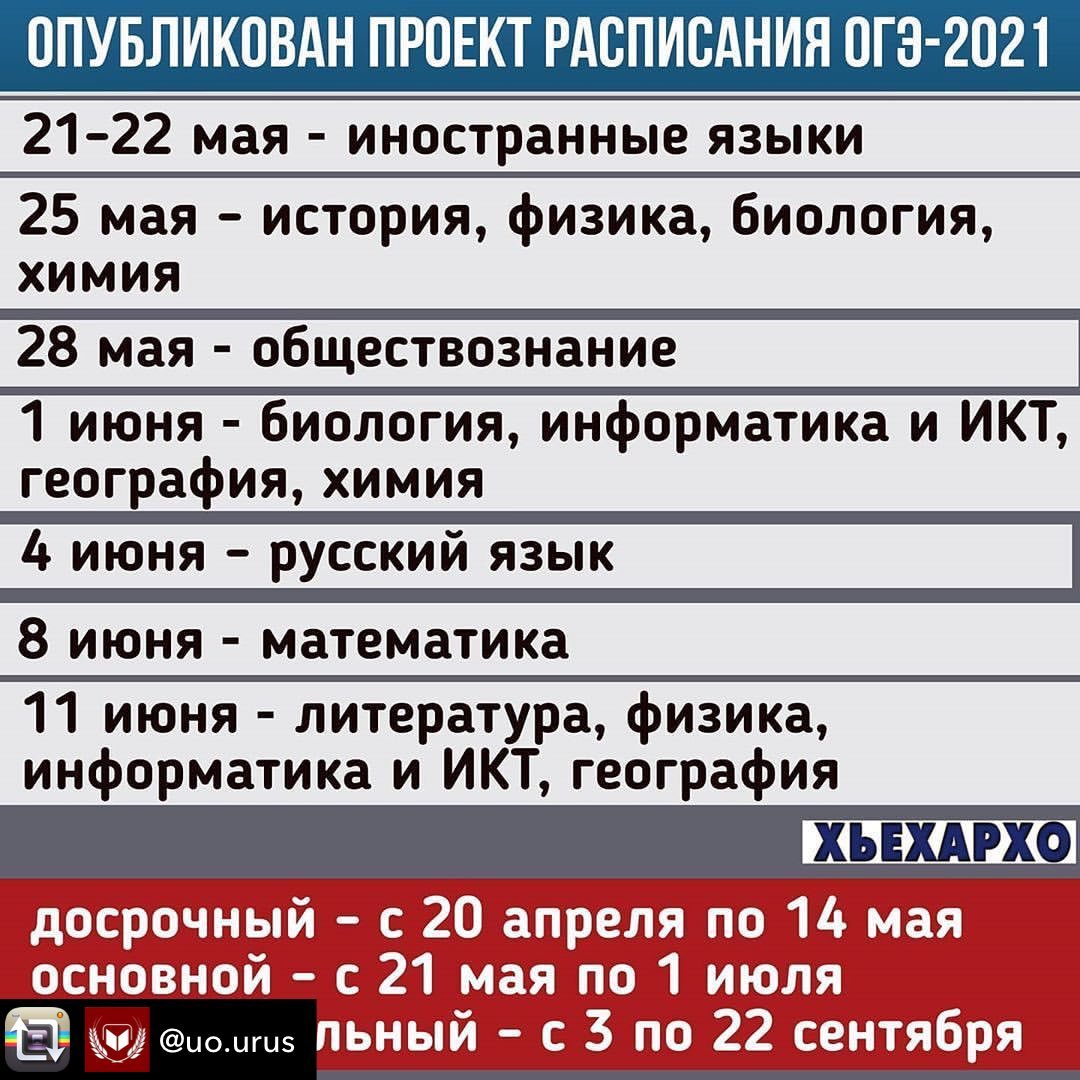 12.10.2020Министерство просвещения опубликовало проект расписания Основного государственного экзамена (ОГЭ) для выпускников девятых классов. Он также пройдет в три этапа: досрочный - с 20 апреля по 14 мая, с 21 мая по 1 июля - основной, и дополнительный - с 3 по 22 сентября.Основной период:21 мая (пятница) - иностранные языки (английский, французский, немецкий, испанский);22 мая (суббота) - иностранные языки (английский, французский, немецкий, испанский);25 мая (вторник) - история, физика, биология, химия;28 мая (пятница) - обществознание;1 июня (вторник) - биология, информатика и информационно-коммуникационные технологии (ИКТ), география, химия;4 июня (пятница) - русский язык;8 июня (вторник) - математика;11 июня (пятница) - литература, физика, информатика и информационно-коммуникационные технологии (ИКТ), география